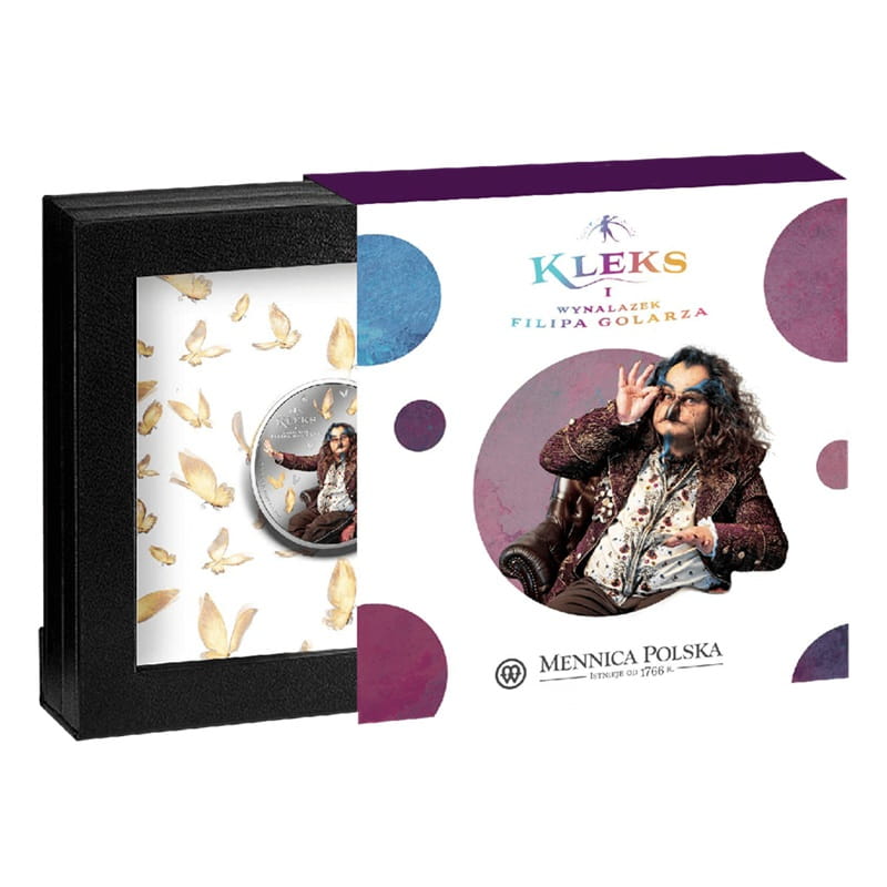 Srebrna moneta kolekcjonerska 1 dolar z serii Akademia Pana Kleksa, producent Mennica Polska S.A., emitent Niue, moneta laserowa matowana z kolorową emalią, metal / stop srebro próby Ag999, średnica 38,61 mm, masa 17,50 gram, rok emisji 2025, nakład emisji 2025, moneta w ramce ekspozycyjnej oraz kartonowym pudełku - obwolucie do ramki, tło ramki kartonowy certyfikat, stan zachowania menniczy
