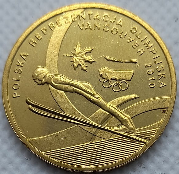Na rewersie skoczek narciarski w locie. Nad nim liść klonowy symbol Kanady oraz logo Igrzysk olimpijskich. U góry monety półkolem napis: POLSKA REPREZENTACJA OLIMPIJSKA, poniżej VANCOUVER 2010.