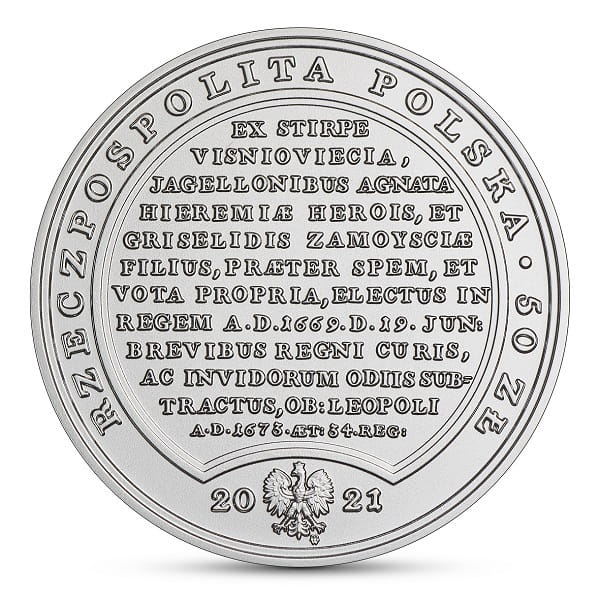 Na awersie monety u dołu na wyodrębnionym polu orzeł w koronie ustanowiony dla godła Rzeczypospolitej Polskiej. Po obu stronach orła przedzielony rok emisji monety: 2022 Wokół rantu monety napis: RZECZPOSPOLITA POLSKA oddzielony kropką od nominału monety 50 zł. Na wyodrębniony polu centralnie po łacinie napisy: EX STIRPE / VISNIOVIECIA, / JAGELLONIBUS AGNATA / HIEREMIÆ HEROIS, ET / GRISELIDIS ZAMOYSCIÆ / FILIUS, PRÆTER SPEM, ET / VOTA PROPRIA, ELECTUS IN / REGEM A.D. 1669. D. 19. JUN: / BREVIBUS REGNI CURIS, / AC INVIDORUM ODIIS SUB= / TRACTUS, OB: LEOPOLI / A.D. 1673. ÆT: 34. REG, zakończony dwukropkiem