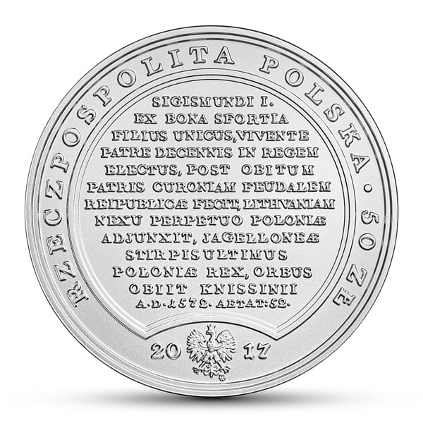 Trzynasta moneta serii przedstawia Zygmunta II Augusta, syna Zygmunta I i Bony Sforzy d’Aragona, ostatniego niezależnego wielkiego księcia litewskiego od 1529, króla polskiego koronowanego formalnie w 1530 (elekcja vivente rege 1529), panującego od 1548 po śmierci ojca. Był ostatnim królem z męskiej linii Jagiellonów. Przyjął jako lenno Inflanty, połączył Polskę i Litwę unią; wyróżniał się tolerancyjną postawą w sprawach wiary, dbał o prestiż państwa i był mecenas kultury.