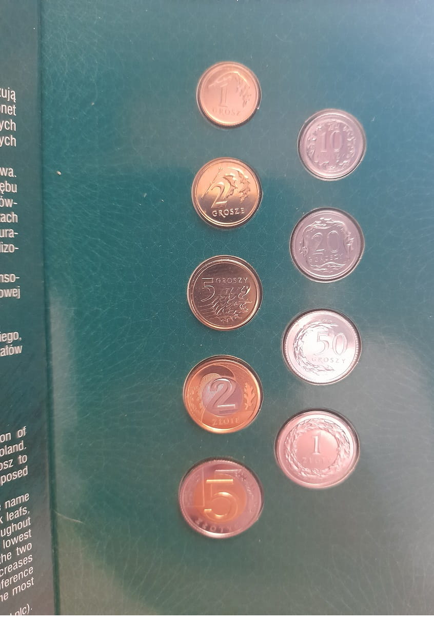 Zestaw wszystkich nominałów polskich monet obiegowych w pomniejszeniu. Spełniają wszystkie normy by być także środkiem płatniczym. Posiadają orła ze znakiem mennicy: m/w